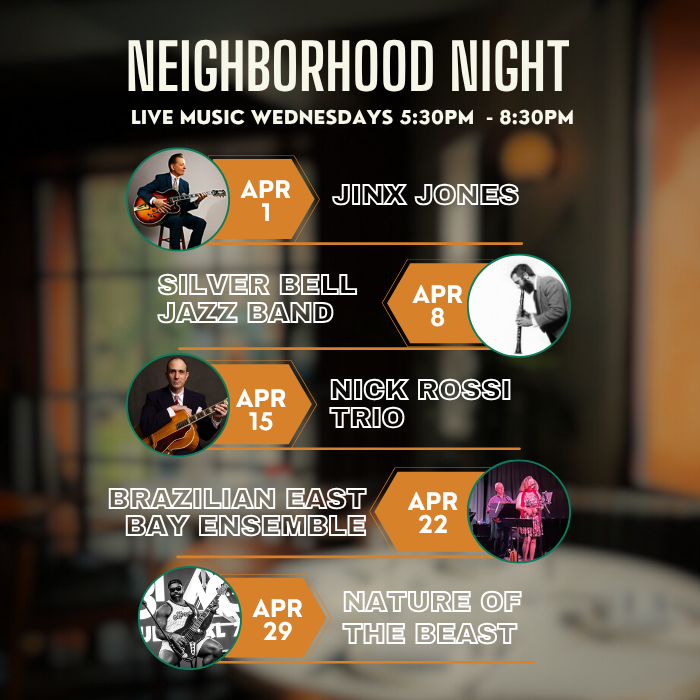 Join us every Wednesday from 5:30pm - 8:30pm for our Neighborhood Night, featuring live jazz and chef specials.
